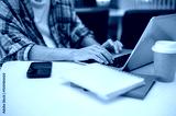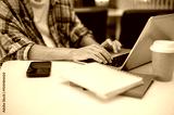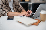 Close up of a man hands typing and tapping on laptop with phone and notebook sits at table in cafe.