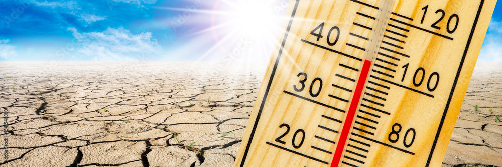 Auf einem Thermometer zeigt die Skala große Hitze - FOTOMONTAGE