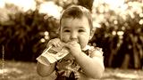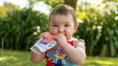 A baby eats pureed fruit or vegetables as a snack from a flexible plastic pouch, outdoors. Pureed fruit from a squeezable pouch.