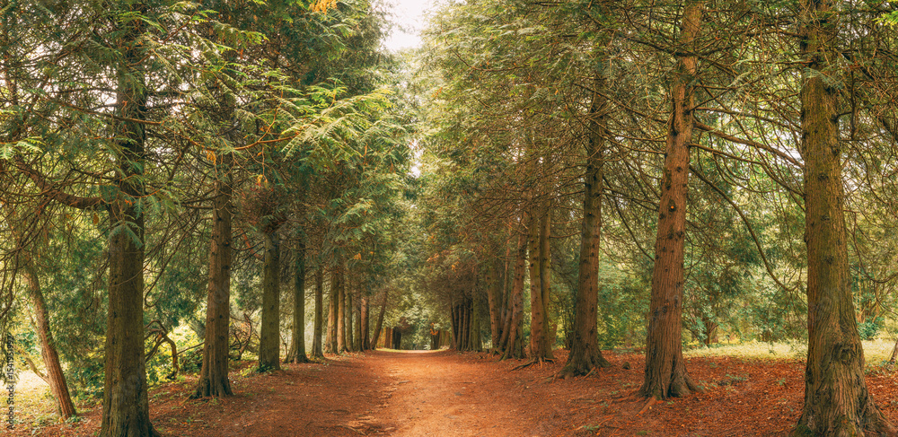 Walkway Lane Path Through Green Thuja Trees In Coniferous Forest. Beautiful Alley, Road In Park. Pathway, Natural Tunnel, Way Through Summer Forest. Panorama