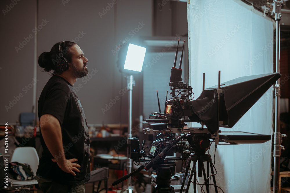 Director of photography with a camera in his hands on the set. Professional videographer at work on filming a movie, commercial or TV series. Filming process indoors, studio