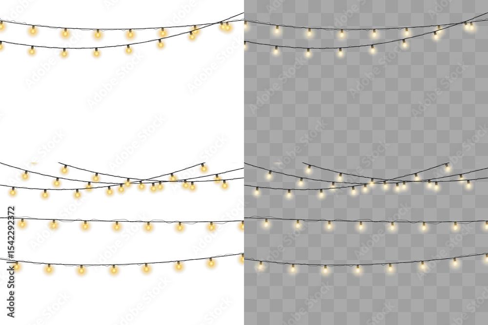 Shiny garland outlines New Year banner. Circle of light forms magical border. Soft yellow bulbs hang on thread. Twilight glow fills joyful evening sky.