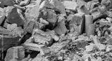 Pile of concrete debris with exposed rebar and pipes after building demolition
