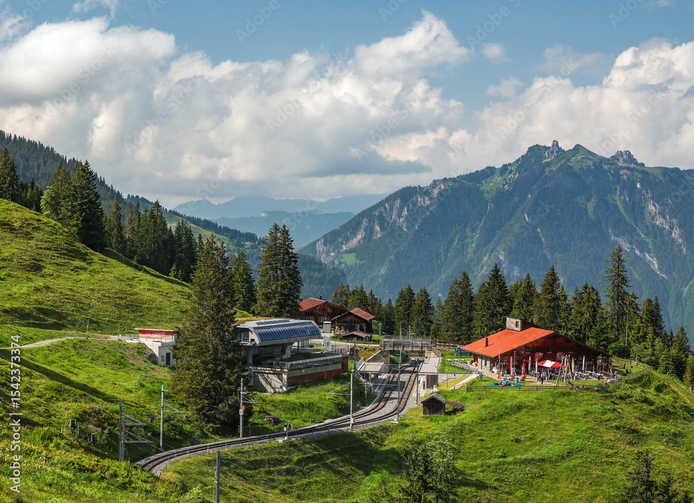 Scenic landscape image of the railway station to Murren, Bernese Oberland, Switzerland, Europe