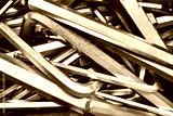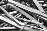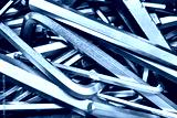 Metal hex keys in toolbox. Set of Allen wrenches scattered. Mechanical repair tools closeup. Industrial steel equipment. Workshop hardware collection.