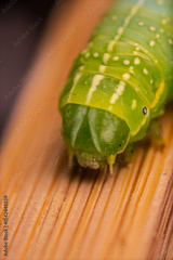 Closeup macro view of green caterpillar on wood.