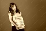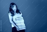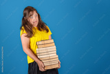Back to school concept. Young blonde tired teen girl holding huge stack of books against blue background