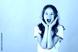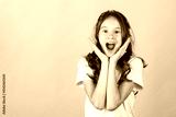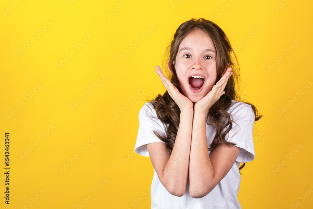Excited screaming surprised young caucasian blonde girl against yellow background