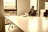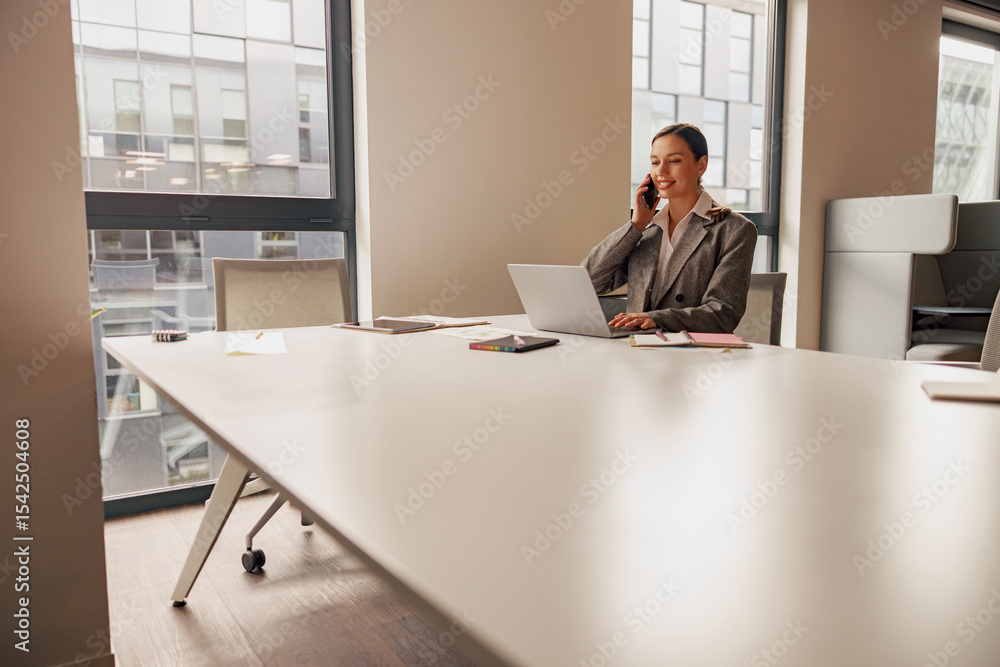 A dedicated businesswoman is making an important call while efficiently working on her laptop in a modern office