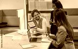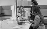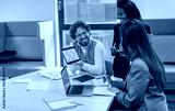 A team engaged in a vibrant discussion about innovative ideas within a modern workspace equipped with digital tools