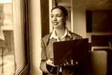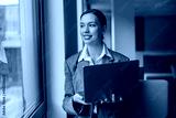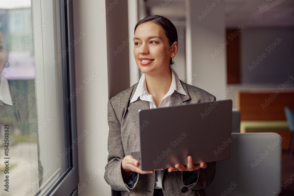A confident woman holds her laptop, gazing thoughtfully out the window in a stylish office, creating power