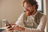 A smiling young man is using his smartphone in a cozy and warm setting, showcasing modern means of communication