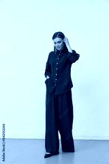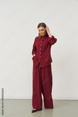Stylish female model showcasing trendy burgundy outfit in studio environment