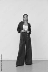 Stylish woman in maroon outfit poses confidently in indoor studio setting