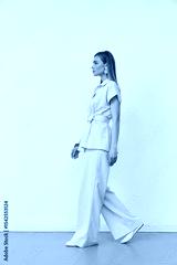 A woman in a beige outfit stands in profile, wearing a belted top and wide-leg trousers. Her hair is long and straight, and she sports large earrings. She appears poised and fashionable