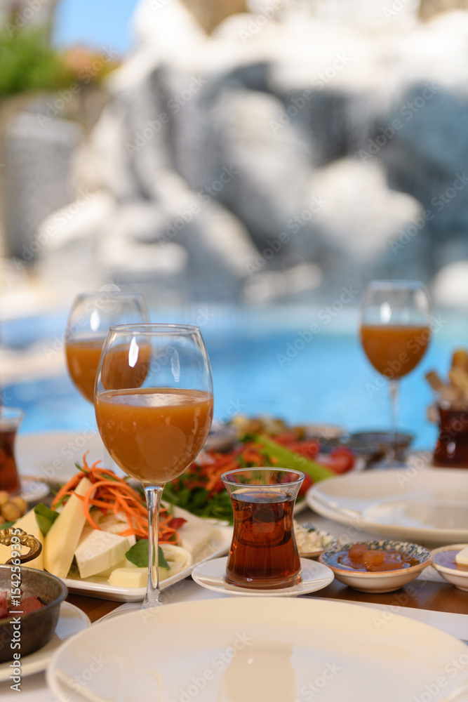 A wooden table set with peach juice, tea, salad, and cheese near a poolside view during a relaxing hotel breakfast experience