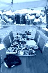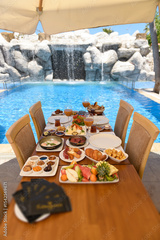 Wooden table set for breakfast with juices, salad, cheese, olives, fruits, and jams. Pool and wooden chairs create a relaxing vacation atmosphere