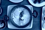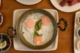 A top view of a hotel breakfast table with fried eggs, sausages, olives with lemon slices, and various side dishes on a wooden surface