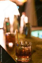 Colorful cocktail served with double straws on stylish hotel bar counter, perfect for vacation relaxation
