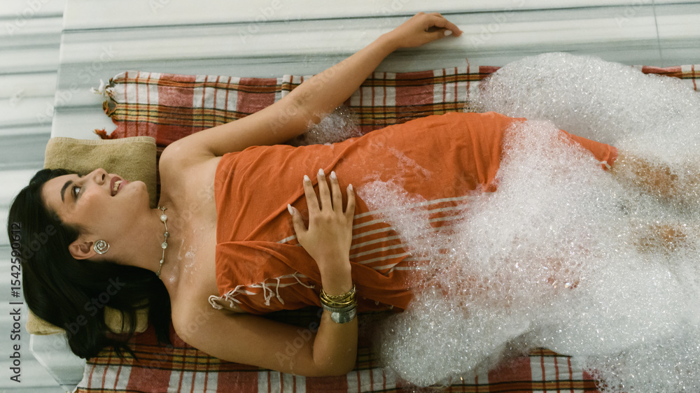 Relaxing Turkish foam massage being performed on a woman at an upscale hotel spa with authentic techniques