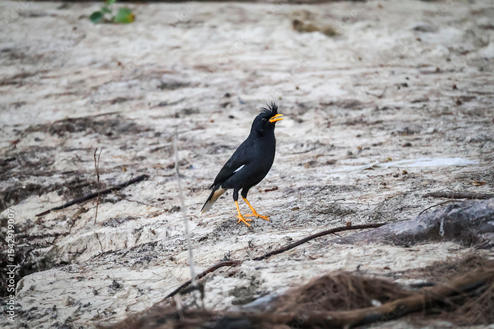 Wild white-vented myna (Acridotheres grandis) foraging on earthy terrain