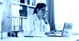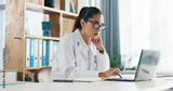 Research, woman and doctor with laptop in hospital for medical report or diagnostic information. Thinking, computer and female healthcare worker with brainstorming for treatment plan in clinic office