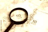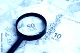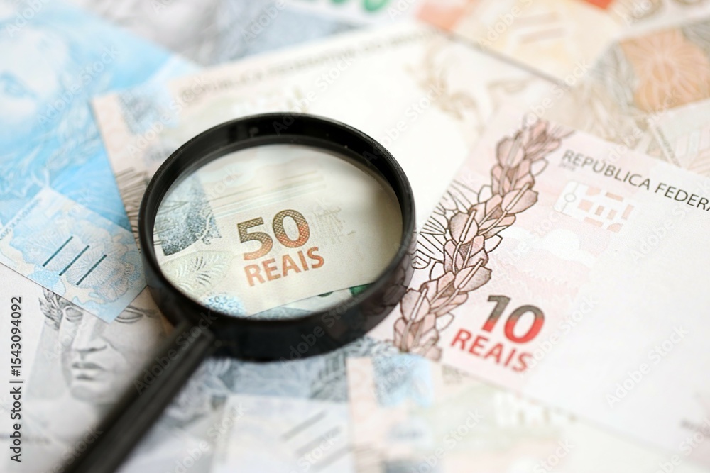 Brazilian reais banknotes and magnifying glass. The current Brazil real money bills and loupe lies on table in big amount. The concept of financial monitoring and taxation in Brazil