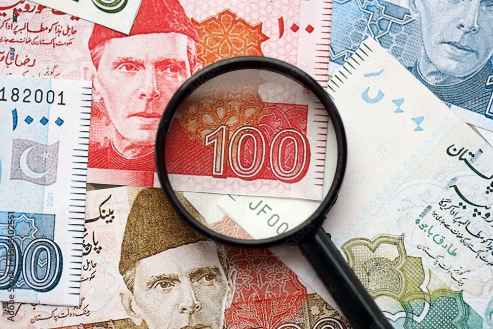Pakistan rupees banknotes and magnifying glass. The current Pakistan money bills and magnifying glass lies on table in big amount. The concept of financial monitoring and taxation in Pakistan