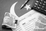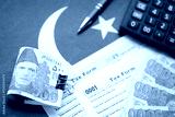 Pakistan rupees banknotes with calculator and tax form. The current Pakistan real money bills and tax blank close up. The concept taxpaying and accounting in Pakistan