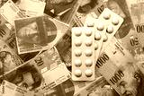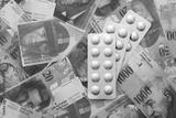Swiss franc banknotes and medicine pills. The current francs money bills and drugs lies on table in big amount. The concept of medicine and pharmacy in Switzerland