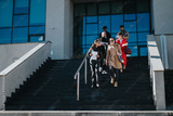 A diverse group of business professionals descending stairs from a modern office building, holding documents and discussing ideas under the bright sun, illustrating collaboration, success, and