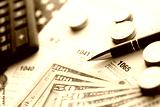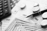 American US dollars money bills and coins with pen and calculator on IRS tax form blanks
