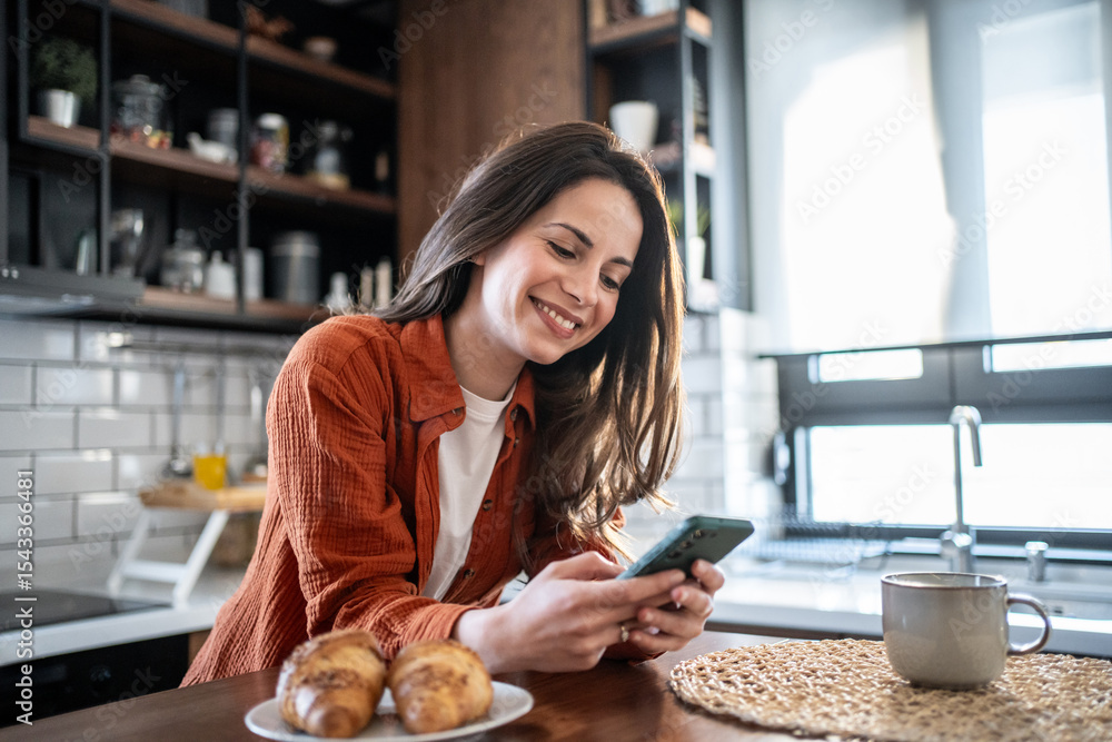 Smiling woman using smartphone and enjoying breakfast in modern kitchen