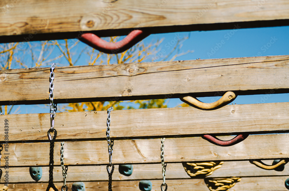 Close up of Various Holds, Chains, and Ropes on a Climbing Structure.