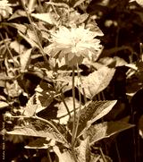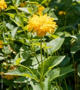 Heliopsis helianthoides 'Scabra'. Heliopsis sunflowers or rough oxeye, with double golden-yellow petals, brown surrounding a brownish center and green ovate toothed leaves