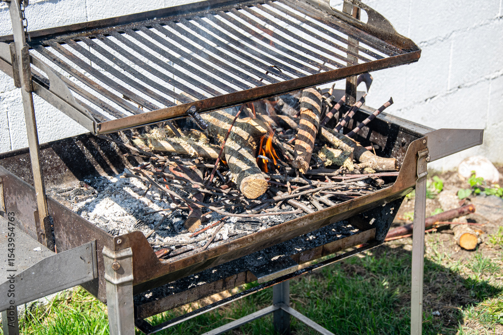 Lighting a Fire for an Outdoor Barbecue. Starting a Charcoal Barbecue with Wood and Kindling.
