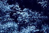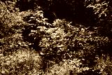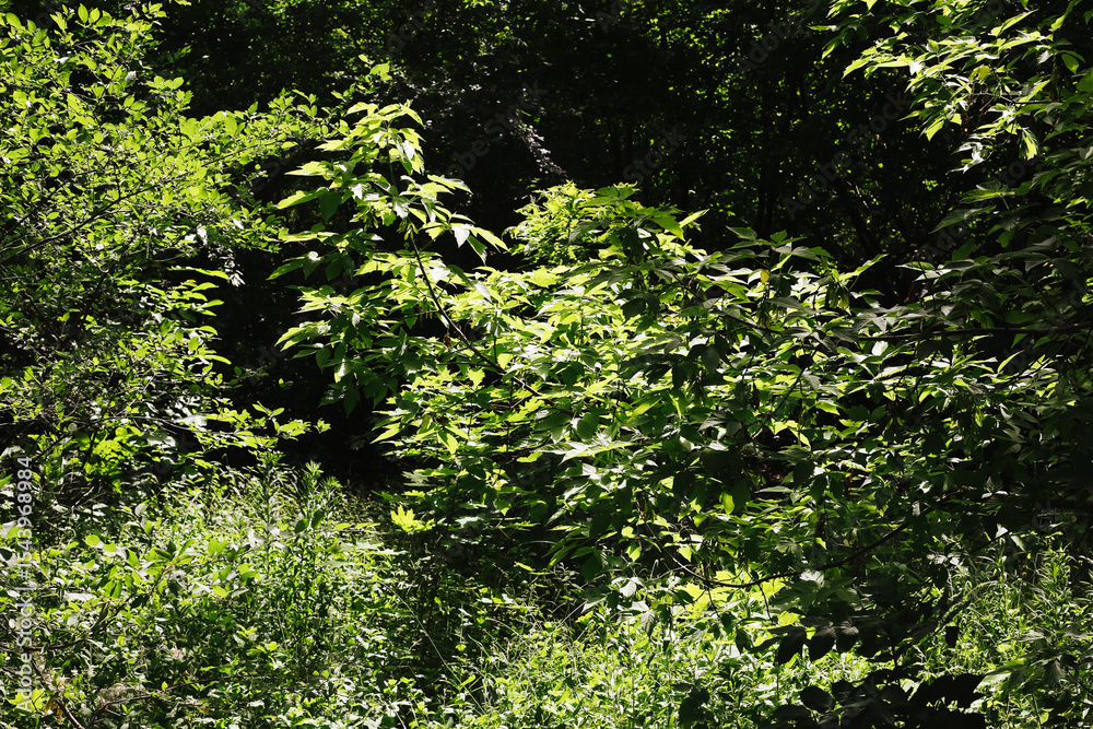 Dense green forest in sunlight. Wild bushes and trees. Natural summer foliage. Untamed overgrown woodland vegetation. Nature exploration scene.