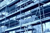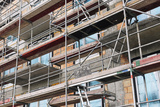 Building facade under renovation. Metal scaffolding in sunlight. Urban construction repair work. Residential wall restoration process. Modern housing upgrade scene.
