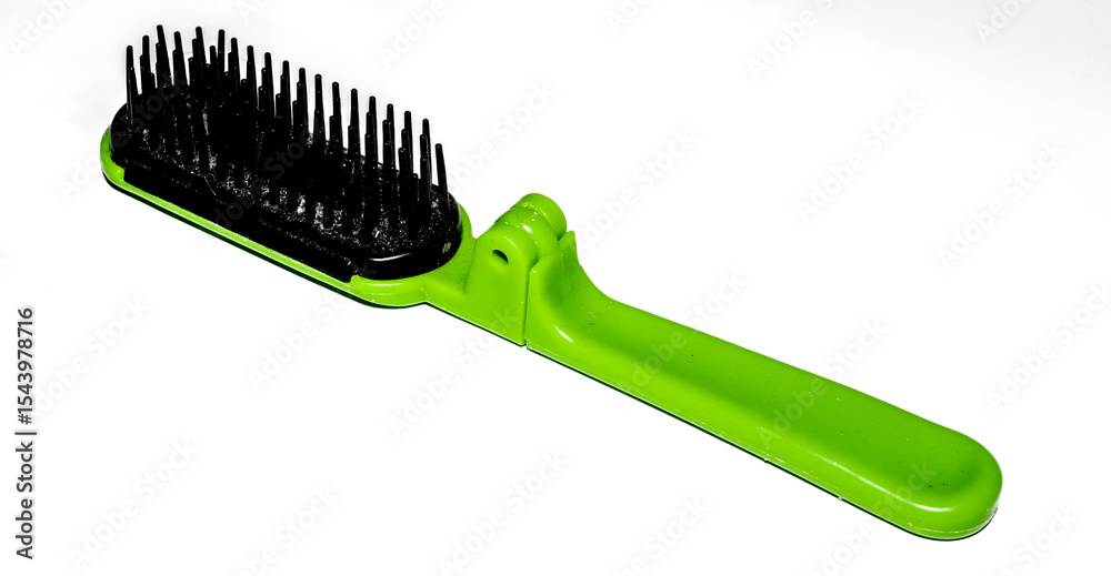 Used green comb with black bristles containing visible dandruff flakes, isolated on a clean white background, ideal for hair care education, dermatology awareness, scalp health campaigns