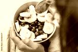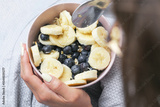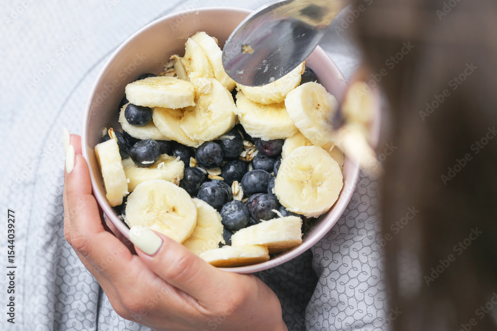 Healthy oatmeal with fruits. Bowl of porridge with banana and blueberries. Hands holding breakfast. Wholesome morning food. Natural ingredients. Vegetarian healthy lifestyle nutrition concept.