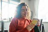 Smiling pretty lady holding smartphone enjoying mobile shopping, checking news on smartphone in cozy morning. Young happy woman using cell phone AI apps drinking coffee relaxing at home.
