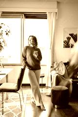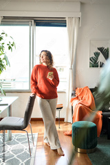 Happy lady looking at cellphone using mobile apps standing in modern casual cozy living room interior. Smiling pretty young woman holding smartphone using cell phone technology at home.