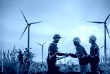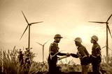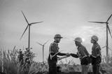 engineer technician team raise joy hand for success happiness at wind power plant machine . silhouette Group of colleague technician professional worker discussion maintenance electronic wind turbine