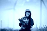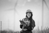 A technician woman wearing a yellow helmet and red jacket is writing on a clipboard