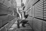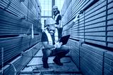 Two workers in a warehouse are checking inventory