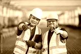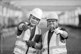 Engineers Teamwork: Confident Workers Giving Thumbs Up at Railway Site Professional Team: Asian Foremen Showing Excellent Work Construction Safety: Engineers in Hard Hats Inspecting Railroad Tracks.