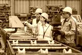 Industrial Factory Workers Wea Safety Helmets and Vests Operating Machinery and Monito Production Line in Manufactu Plant