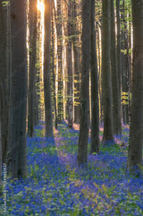 The rising sun illumingating a flowerbed of bluebells in the Hallerbos, on an early spring morning.