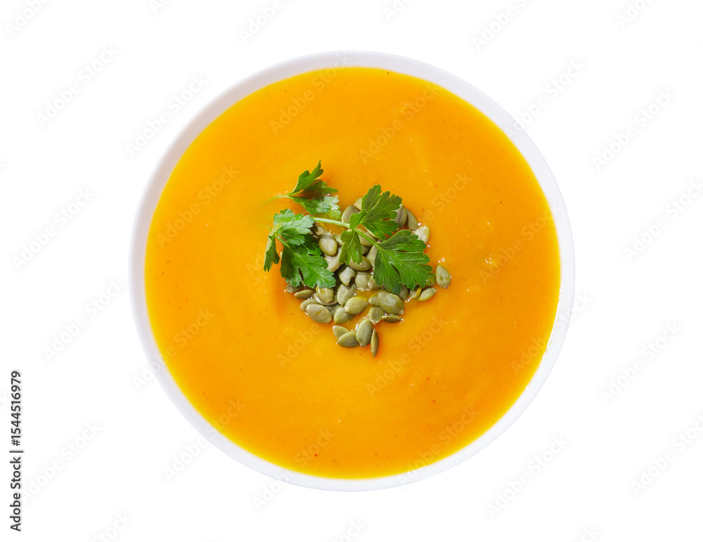plate of pumpkin soup with parsley and seeds isolated on transparent background, top view