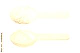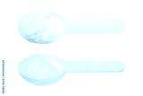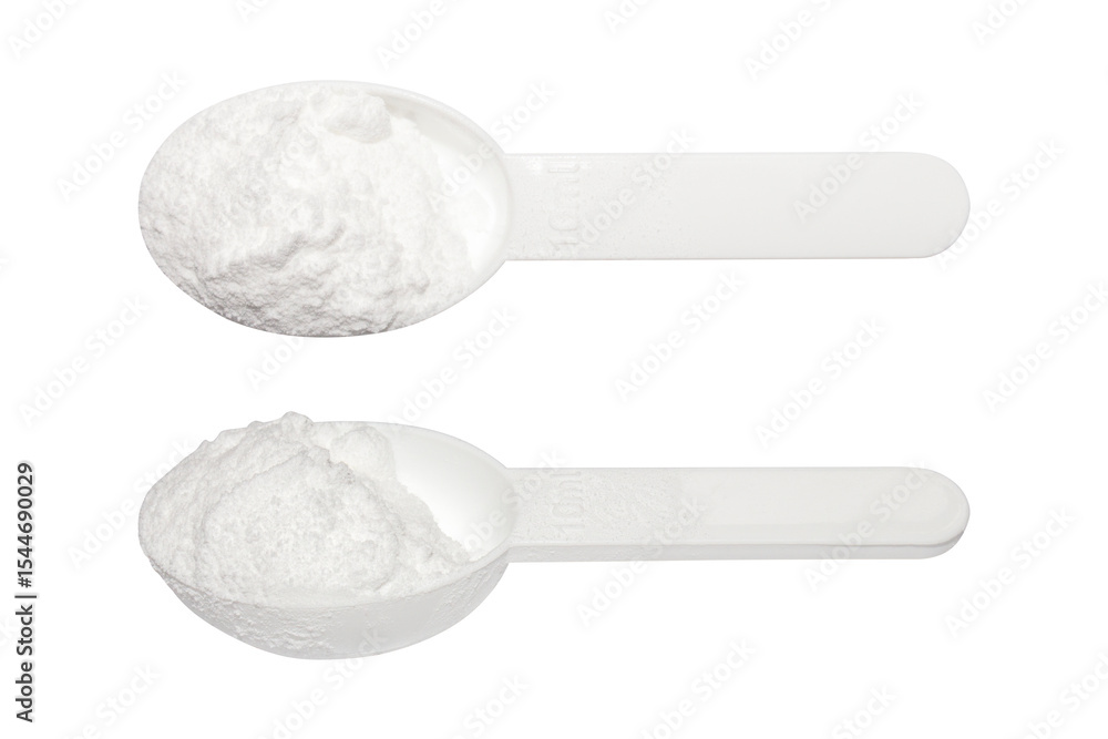 Creatine in a measuring plastic spoon on a white background.Creatine monohydrate.Creatine for endurance in training.